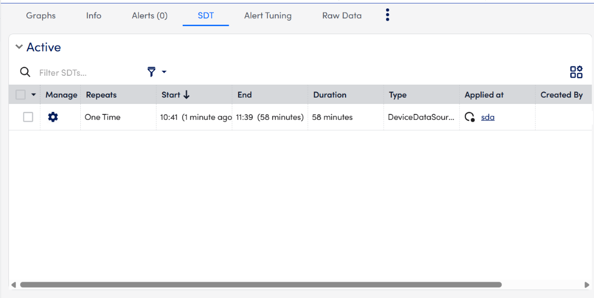 Active SDT Displays all SDTs that are currently running. These are the maintenance windows actively suppressing alerts on the selected group, device, or datapoint.