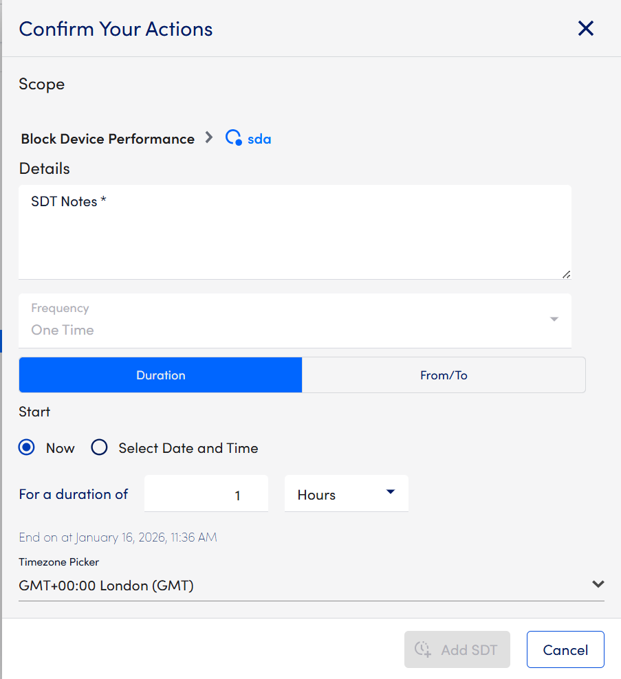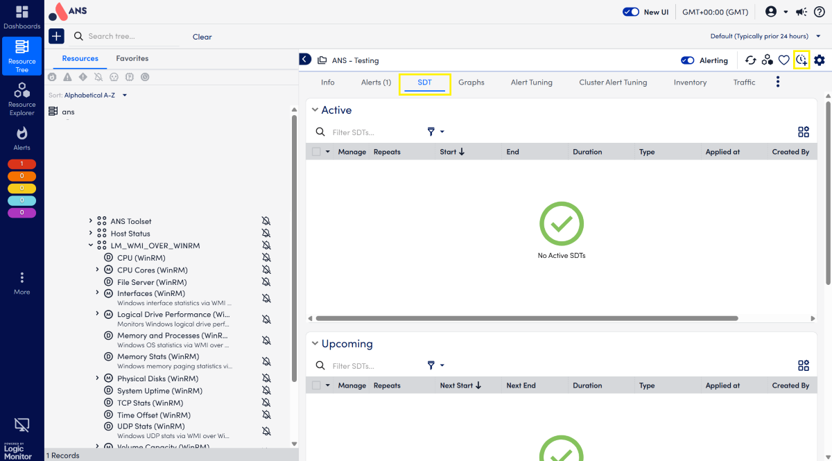 Once an SDT has been created, you can view and manage it from the SDT tab. This tab is divided into three sections—Active, Upcoming, and Historical—which helps you clearly understand what maintenance periods are currently in effect, what is scheduled for the future, and what has already completed.