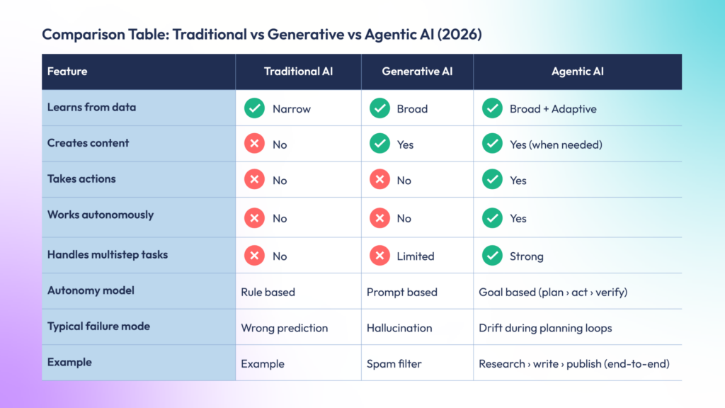 Traditional and generative AI systems wait for direction, operating within clearly defined prompts, inputs, and outputs. They generate content or insights, but they don’t act independently.